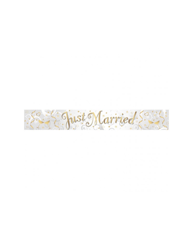 Fóliový strieborno - zlatý banner s nápisom Just Married je perfektnou dekoráciou svadobnej miestnosti.