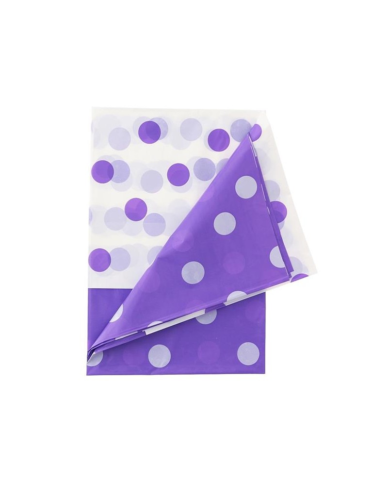 Fialovo-biely fóliový obrus s bodkami je perfektným doplnkom oslavy narodenín.