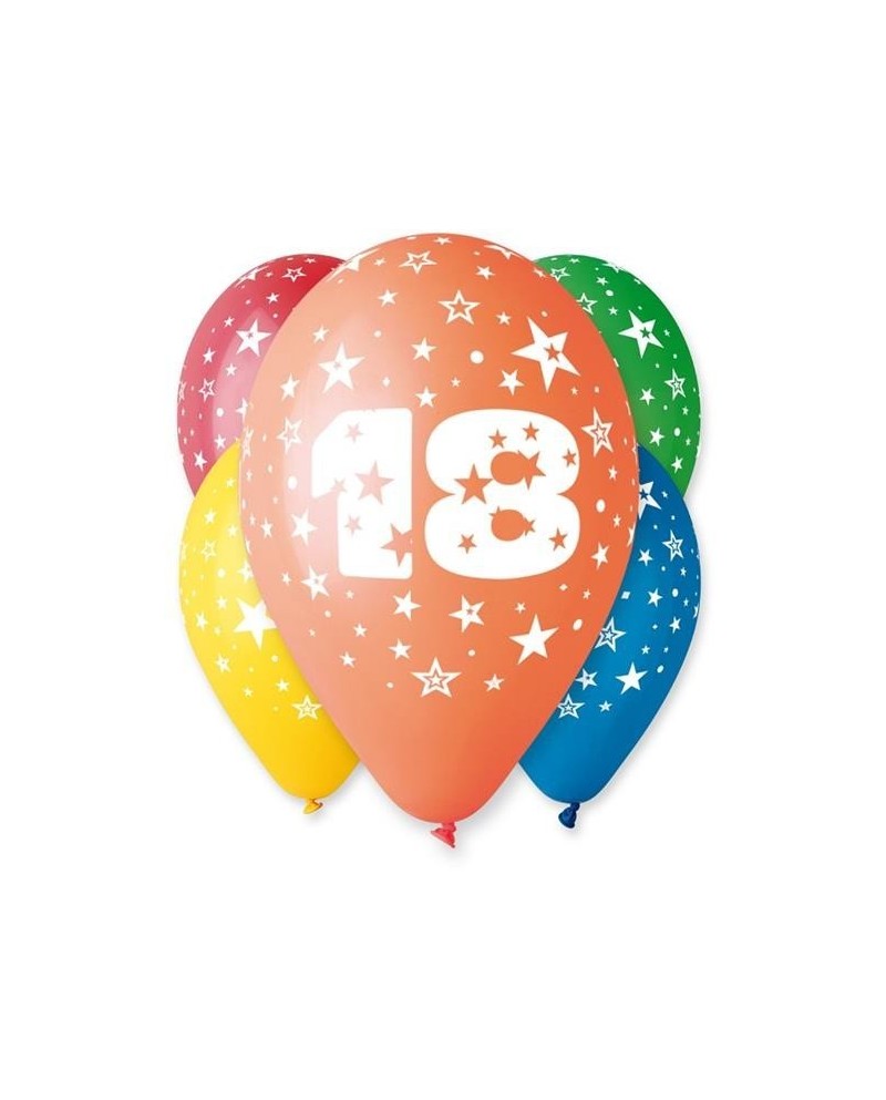 Rôznofarebné latexové balóniky s číslicou 18 a hviezdami sú ideálnym doplnkom oslavy 18. narodenín.