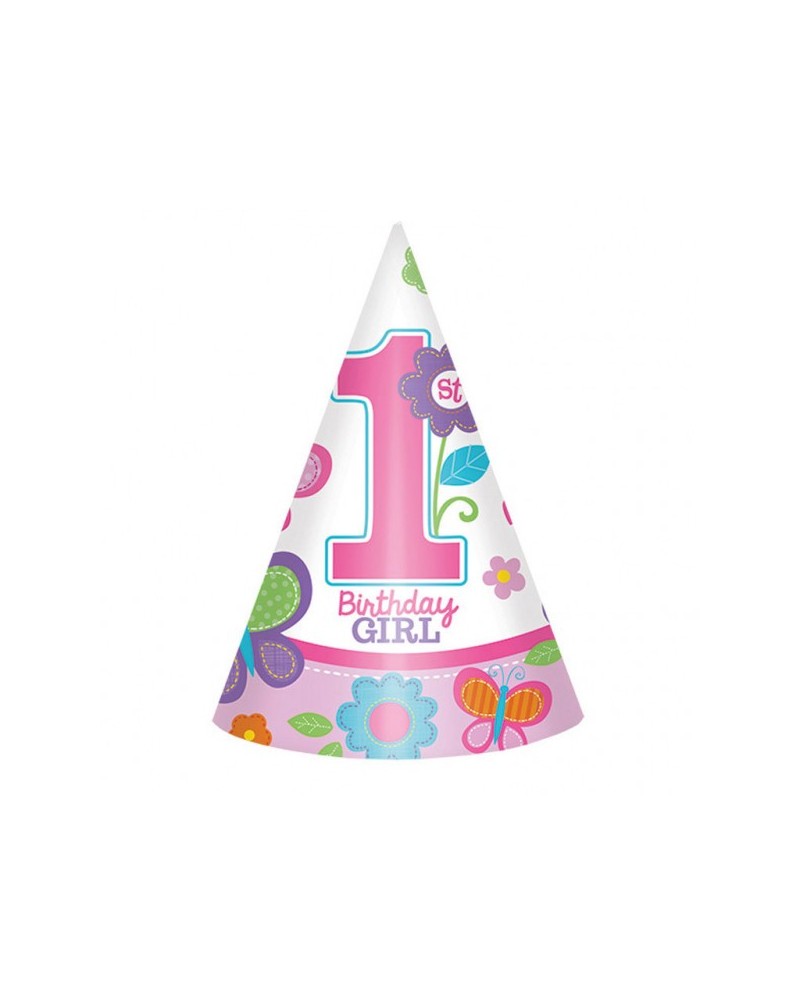 Papierový klobúčik s motívom Birthday Girl s číslom 1 a motýľmi je perfektným doplnkom oslavy prvých narodenín.