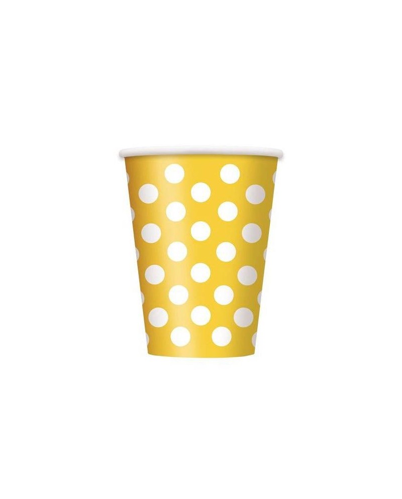 Žlté papierové poháriky s bielymi bodkami sú ideálne na narodeninové oslavy a rôzne iné príležitosti.