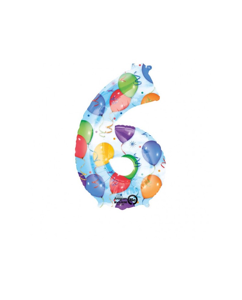 Fóliový balónik číslo - 6 s motívom balónikov vo veľkosti 55x88 centimetrov je perfektným doplnkom narodeninovej oslavy.