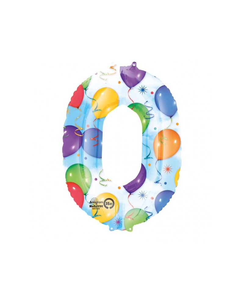Fóliový balónik číslo - 0 s motívom balónikov vo veľkosti 66x88 centimetrov je perfektným doplnkom narodeninovej oslavy.