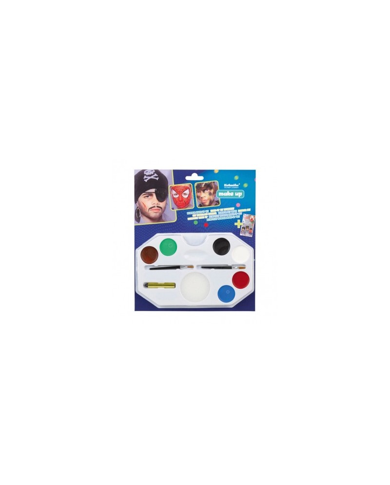 Make-up sada obsahuje nasledovné farby - hnedú, zelenú, čiernu, bielu, červenú a modrú, pomocou ktorých viete vytvoriť masku čerta, piráta alebo známej postavy Spidermana. Fantázii sa medze nekladú, a preto je len na Vás, čo sa Vám podarí vykúzliť s týmito farbami na tvár.