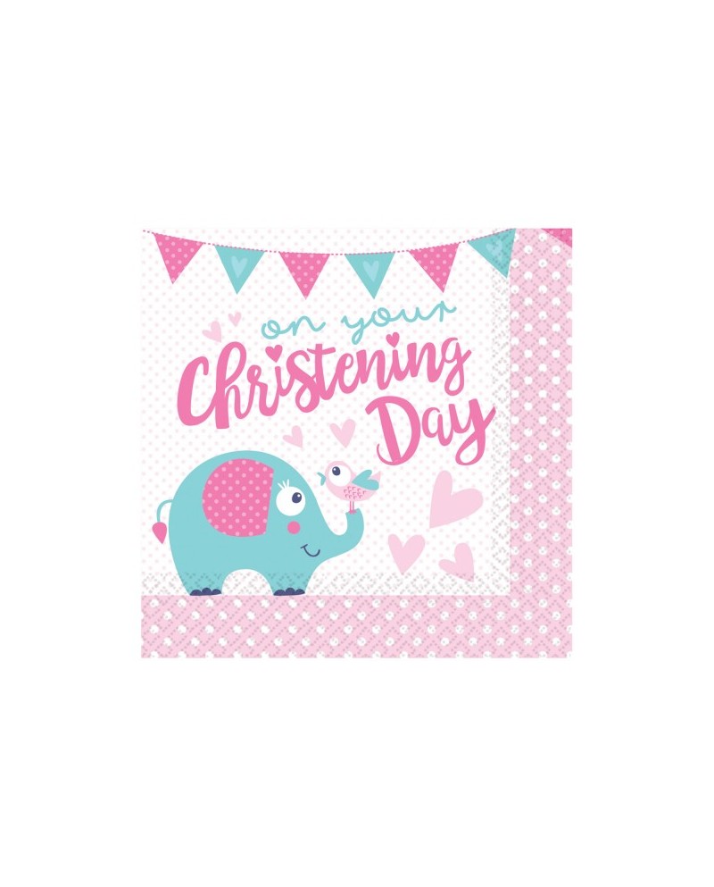Ružové papierové servítky so sloníkom a nápisom Christening day.