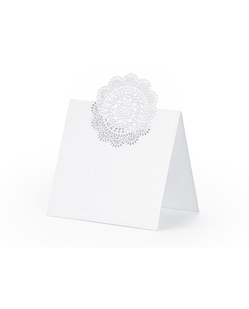 Biele papierové menovky pre svadobných hostí s dekoráciou kvetu.