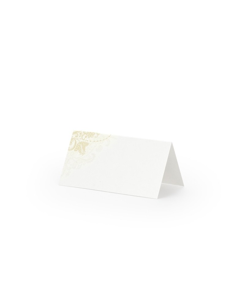 Papierové menovky pre svadobných hostí v krémovej farbe sú dekorované zlatými ornamentami.