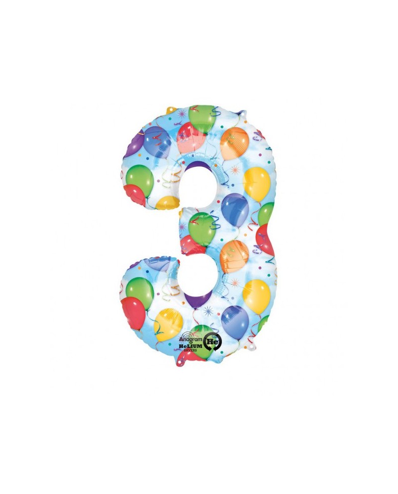 Fóliový balónik číslo - 3 s motívom balónikov vo veľkosti 53x88 centimetrov je perfektným doplnkom narodeninovej oslavy.