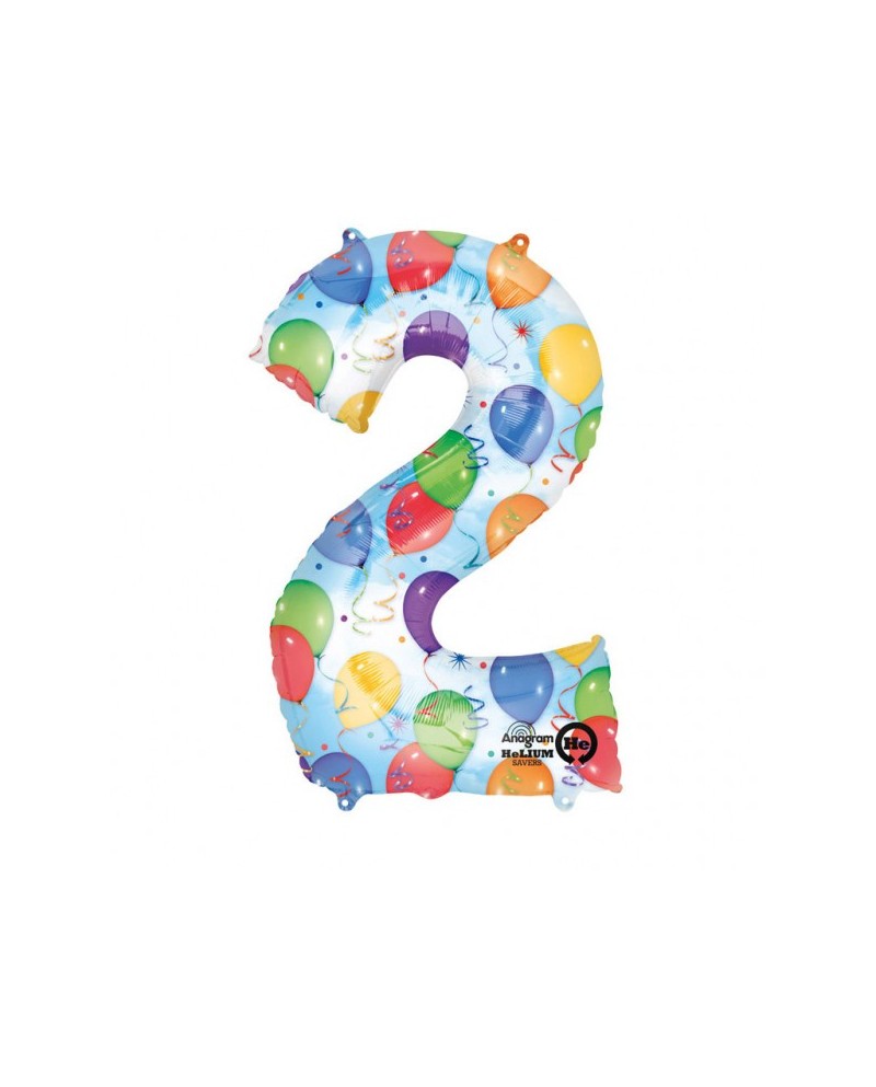 Fóliový balónik číslo - 2 s motívom balónikov vo veľkosti 50x88 centimetrov je perfektným doplnkom narodeninovej oslavy.
