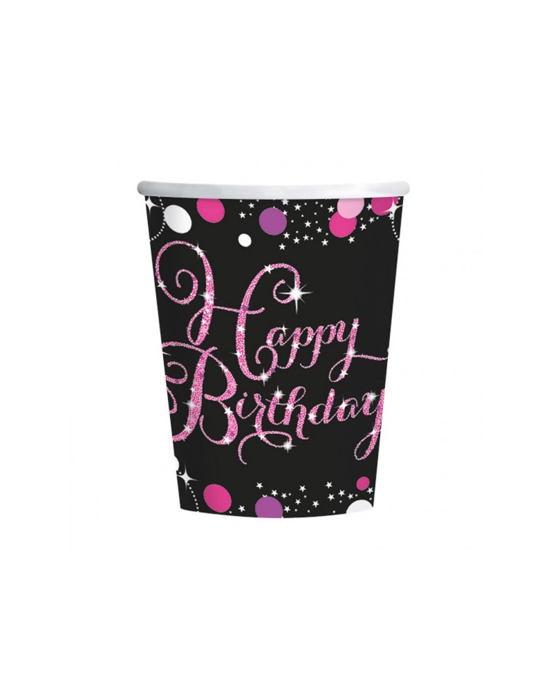 Čierne papierové poháriky s ružovým nápisom Happy Birthday sú ideálnym doplnkom oslavy narodenín.