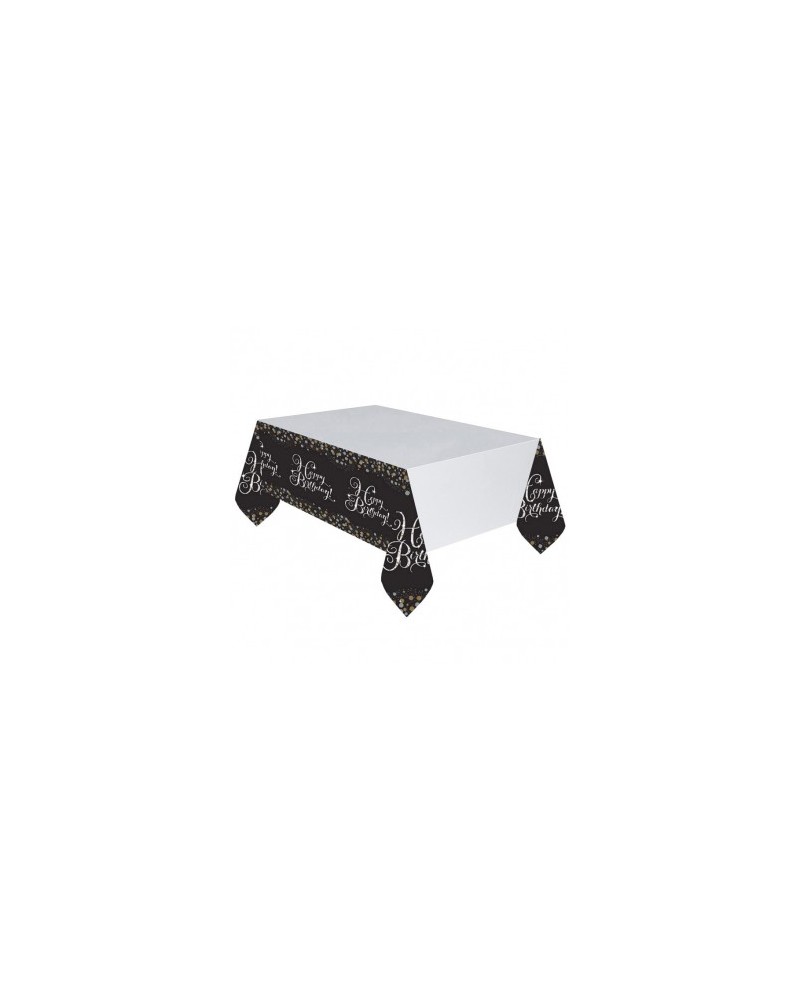 Čierno-biely fóliový obrus s nápisom Happy Birthday je ideálnym doplnkom oslavy narodenín.