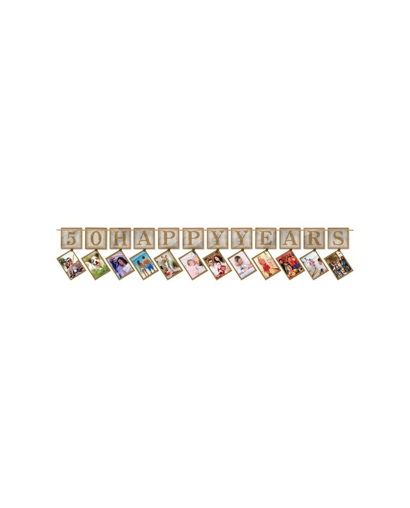 Zlatá girlanda s nápisom 50 Happy Years (50 šťastných rokov), ktorá obsahuje 12 kariet na uchytenie fotografií.