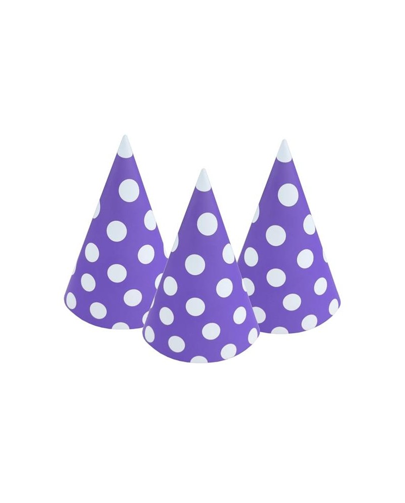 Papierové fialové klobúčiky s bielymi bodkami sú perfektným doplnkom narodeninovej oslavy.