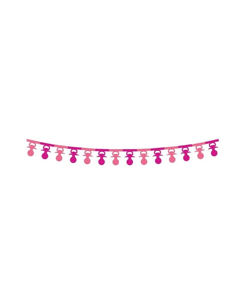 Papierová girlanda v tvare ružových cumlíkov je perfektnou dekoráciou oslavy narodenia dieťaťa.
