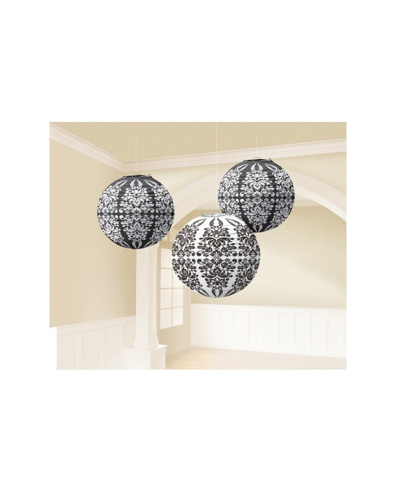 Dekoratívne papierové lampióny v bielej/čiernej farbe so vzorom damašk v tvare lopty.