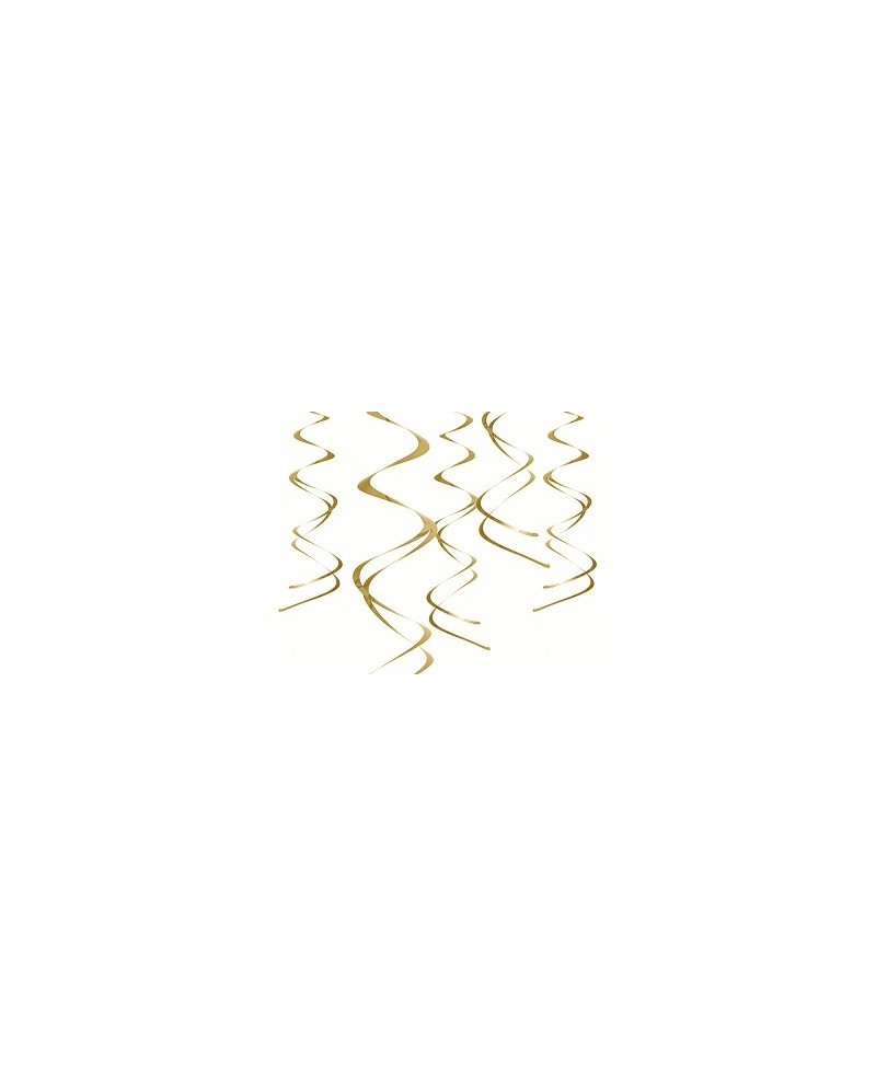 Papierová visiaca dekorácia v tvare zlatých špirál je vhodnou dekoráciou oslavy narodenín.