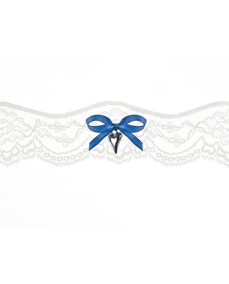 Čipkovaný biely podväzok pre nevestu s modrou mašličkou a strieborným srdiečkom.