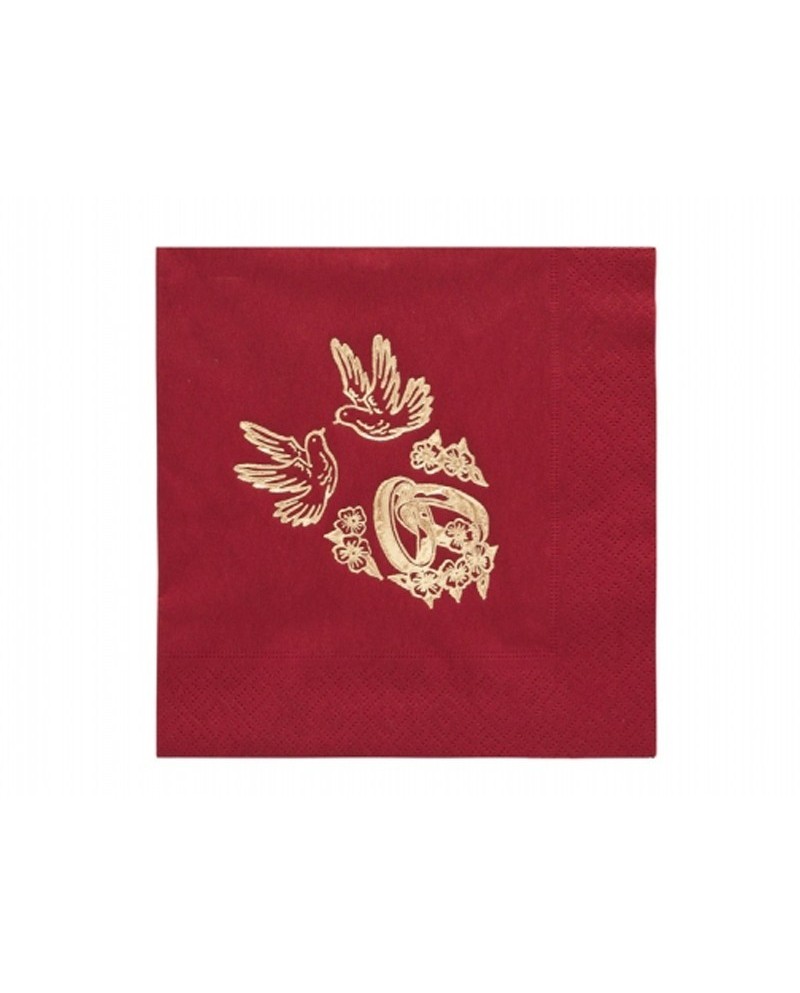 Bordové papierové servítky s motívom zlatých holubíc a obrúčok sú ideálnym doplnkom svadby.