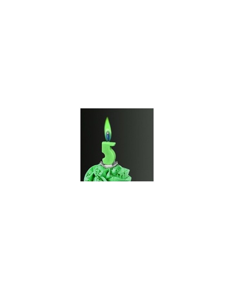 Narodeninová zelená sviečka v tvare číslice 5 so zeleným plameňom.