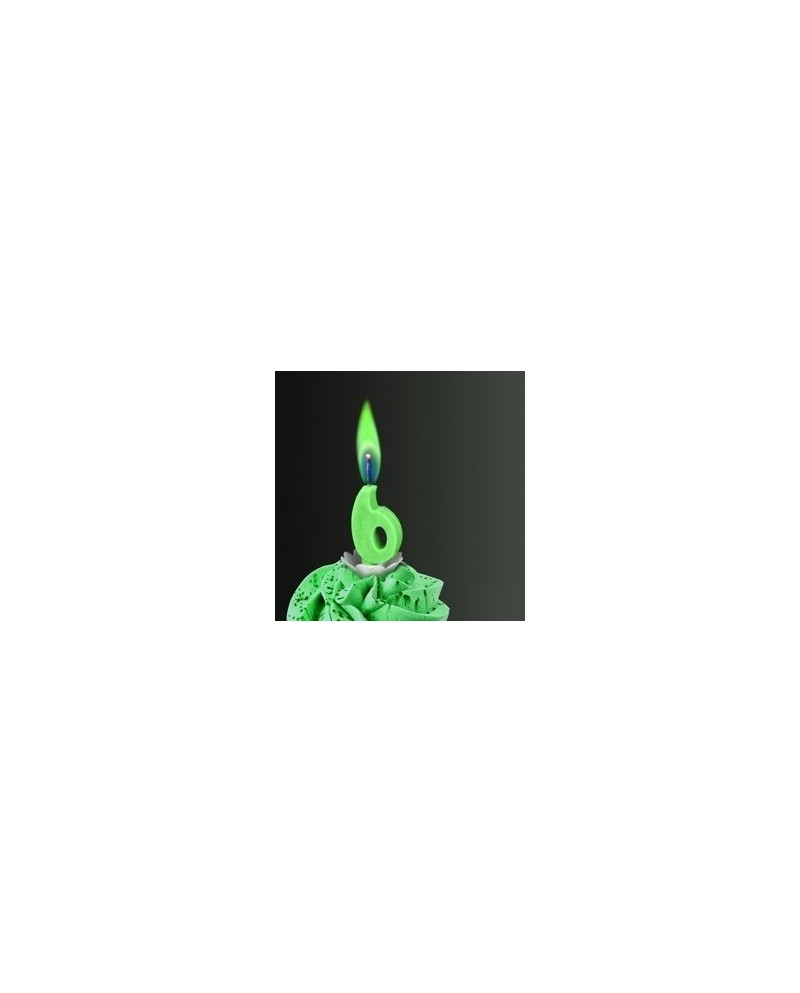 Narodeninová zelená sviečka v tvare číslice 6 so zeleným plameňom.