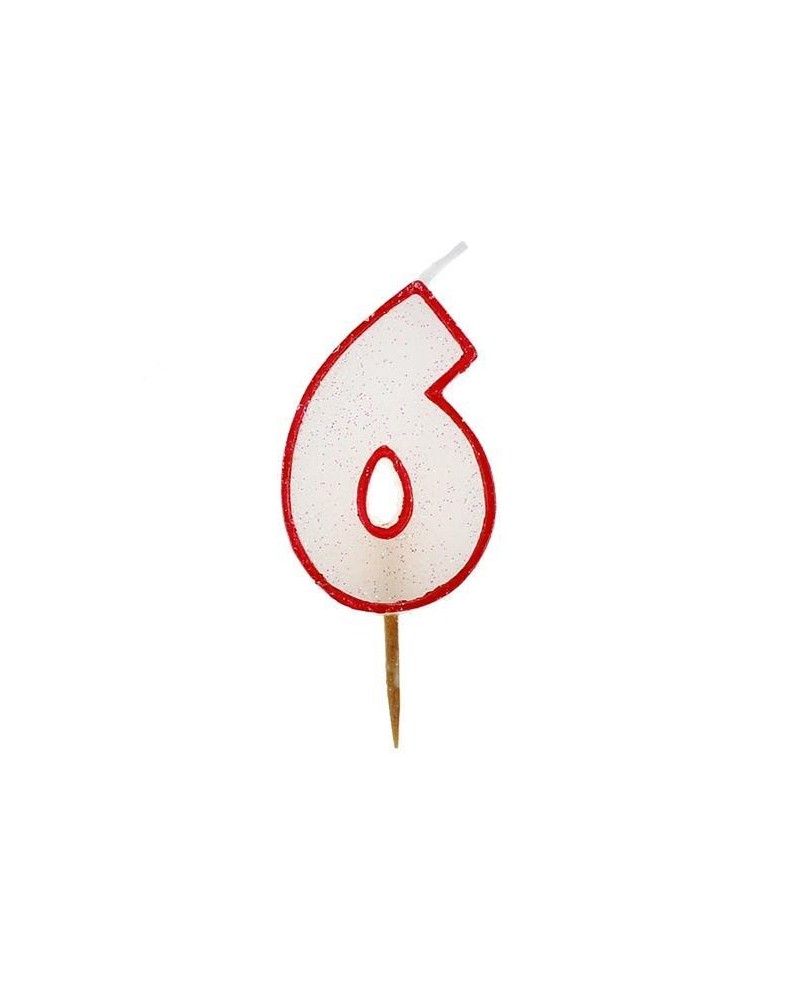 Trblietavá sviečka v tvare čísla "6" s červeným okrajom.