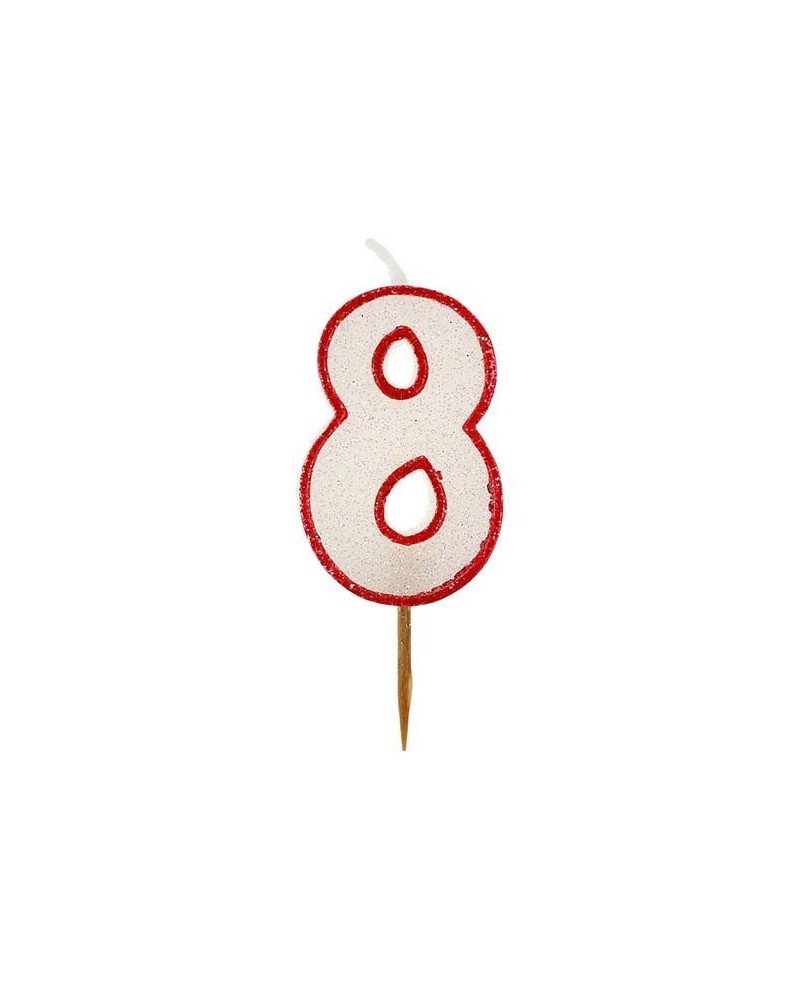 Trblietavá sviečka v tvare čísla "8" s červeným okrajom.