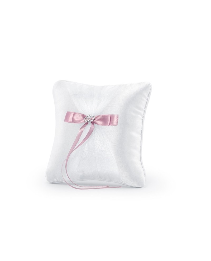 Biely saténový vankúšik na snubné prstene je dekorovaný ružovou mašľou a striebornými srdiečkami.